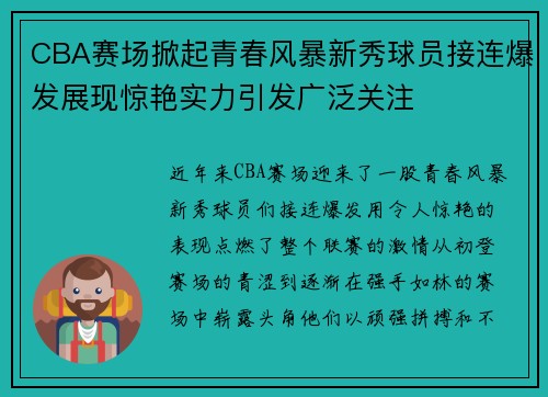 CBA赛场掀起青春风暴新秀球员接连爆发展现惊艳实力引发广泛关注